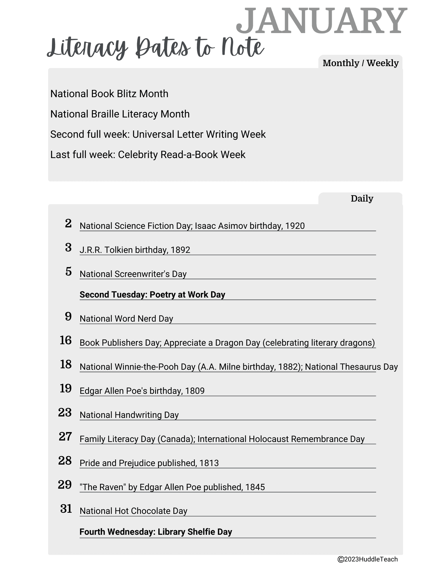 January Literary Calendar