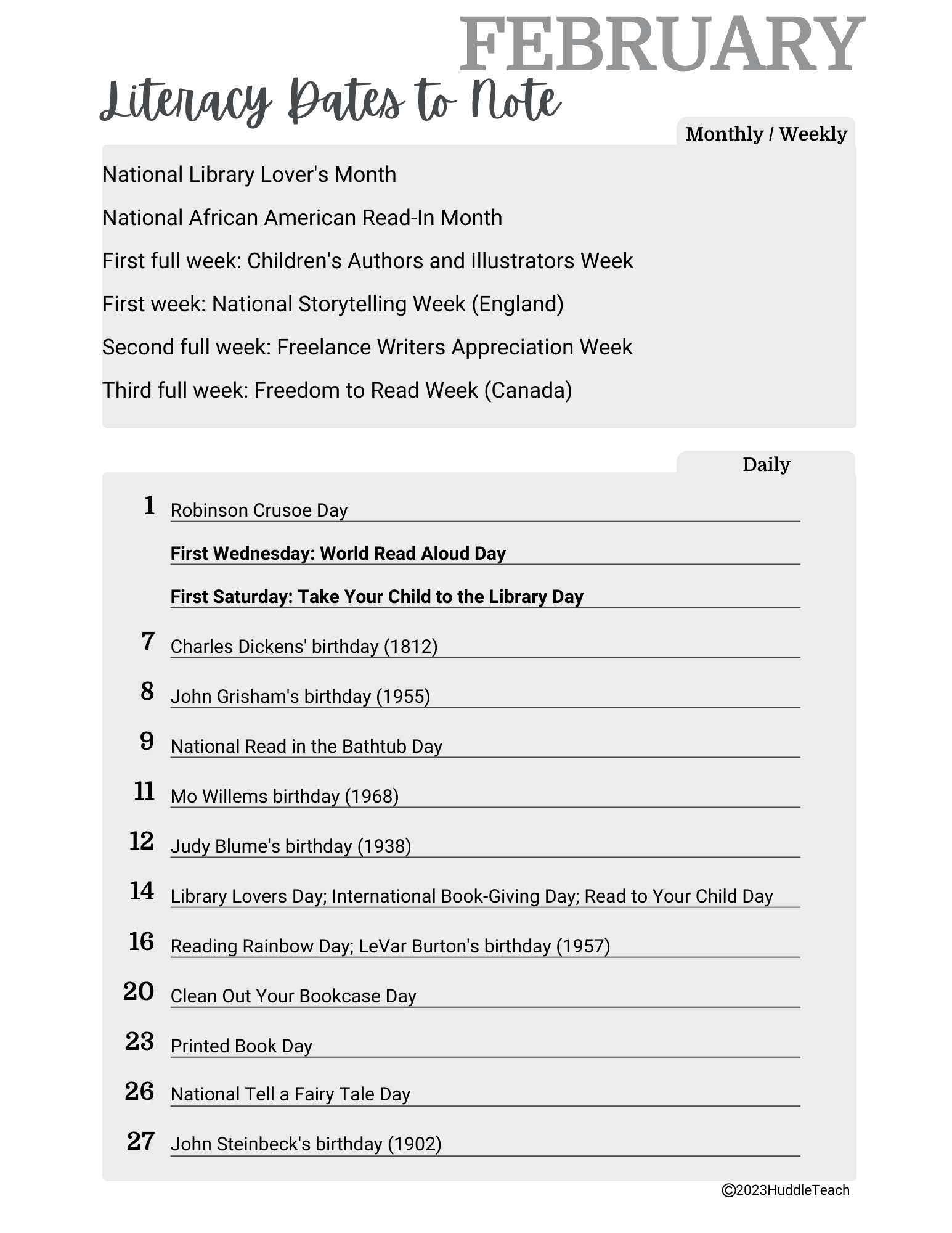 February Literary Calendar for Middle School and High School